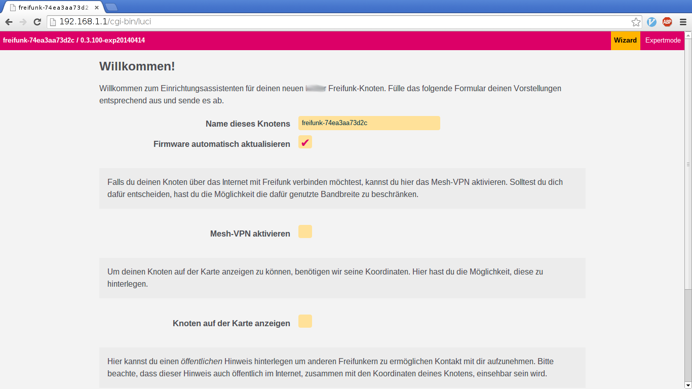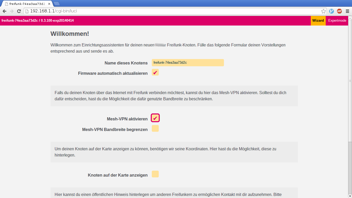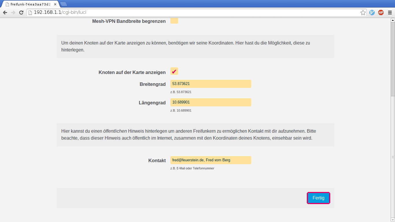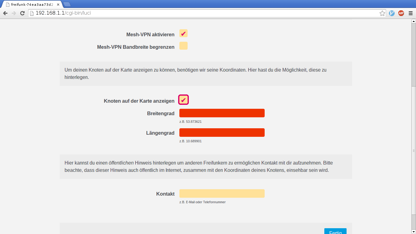 Wenn du möchtest, dass du und andere Mitmenschen den Standort deines Knotens in der Freifunk-Karte sehen können, dann musst du hier ein Häkchen setzen und die rot unterlegten Felder ausfüllen. Die Werte dazu kannst zum Beispiel mit Hilfe des Stecknadel-Knopfes in der angesprochenen Karte ermitteln. Außerdem gibt es inzwischen noch ein Feld für die Höhe in Metern über dem Boden. Schätze diesen Wert einfach indem du 3 Meter pro Stockwerk rechnest.