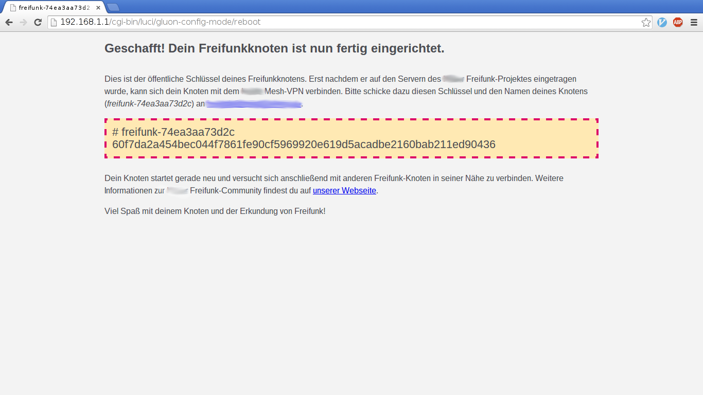 Die nun erscheinende Seite fasst zusammen, was du als nächstes tun solltest. Hast du in Schritt 4 das Mesh-VPN aktiviert, zeigt die Seite wie in der Abbildung einen eingerahmten Block an, welcher deinen Knoten Namen und einen VPN-Schlüssel enthält. Sende den Inhalt dieses Blocks an freifunk-keys@lists.in-kiel.de.