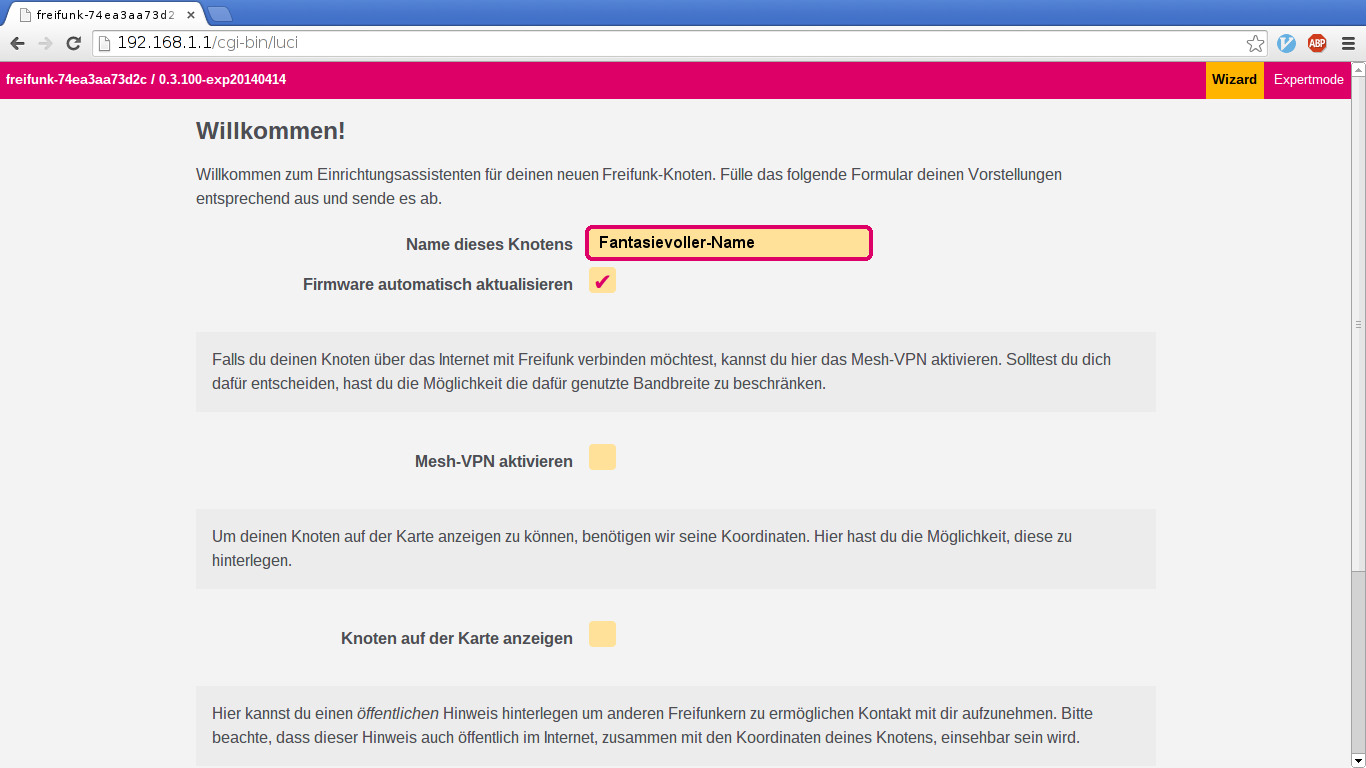 Als Erstes gibst du deinem Knoten einen Namen geben. Nimm einen, der dir gefällt und der vielleicht ein wenig über den Standort des Knotens aussagt. z.B. FreeWayLan. Bitte achte darauf, dass keine Leerzeichen im Namen erlaubt sind. Wenn du ein Leerzeichen brauchst, verwende einen Unterstrich.